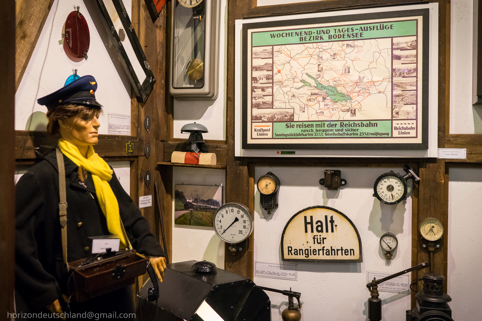 角落中不时有穿着当年制服的人偶。 墙上挂的地图还是百多年前符腾堡自治王国威廉二世时期印制的, 地图上向人们指明博登湖地区周末和度假的好去处。